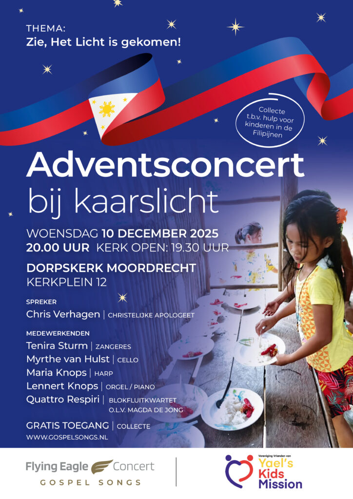 M.m.v. Lennert Knops orgel/ piano, Maria Knops harp, Myrthe van Hulst cello, Tenira Sturm zangeres en Blokfluitensemble Quattro Respiri o.l.v. Magda de Jong, spreker Chris Verhagen t.b.v. Vereniging vrienden van Yaels Kids Mission. Toegang gratis, collecte t.b.v. Vereniging vrienden van Yaels Missions.
